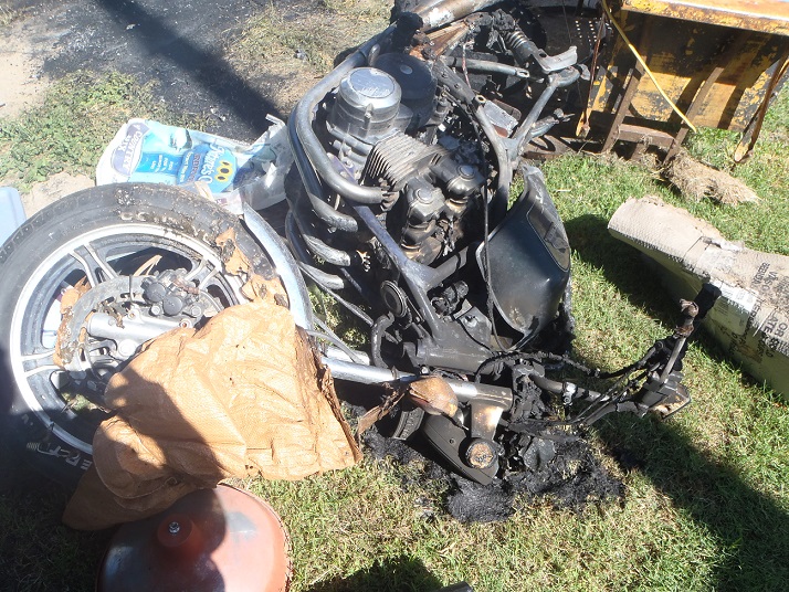A gas can that was left nearby the mower fueled the blaze that destroyed a 1982 Honda Gold Wing motorcycle, weed eater and vinyl siding.