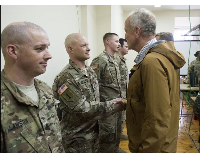 Sen. Moran greets Kansas soldiers at Powidz Air Base in Poland. In Poland, Sen. Moran met SSG Joseph Nilges from Manhattan, SSG Kerry Lawson from Junction City, SGT Joshua Throener from Junction City, SGT Darbyzackery Comer from Manhattan and SPC Vivian Gianelloni from Manhattan. The Dagger Brigade of the 1st Infantry Division at Ft. Riley will also deploy to Poland in the coming weeks.( U.S. Army photo)