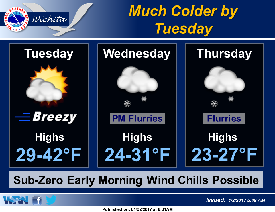 Overnight temperatures will fall into the single digits and teens, with breezy north winds supporting sub-zero wind chills during the early morning over mainly the northern half of Kansas.