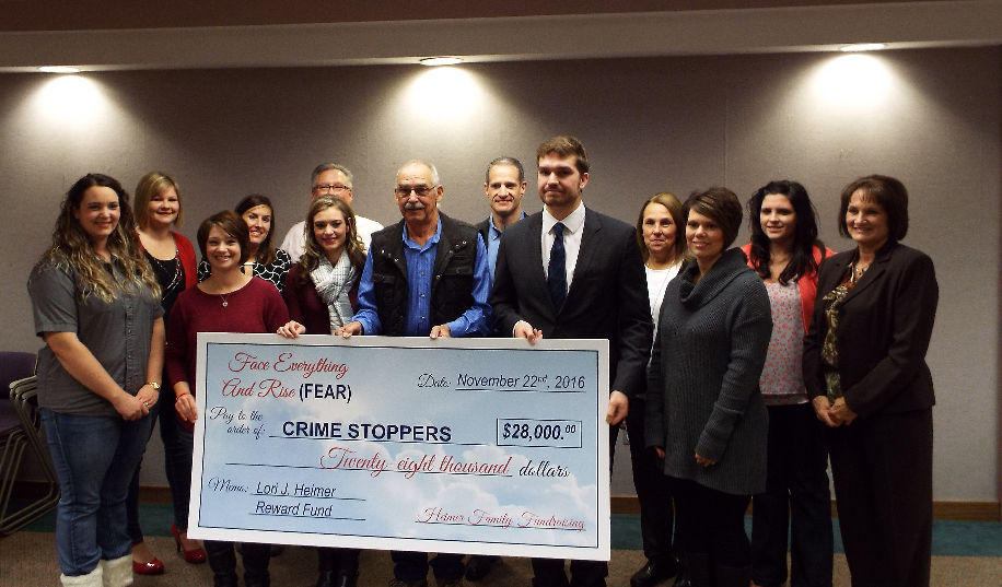 The Heimer family presented their $28,000 to the Crime Stoppers organization Tuesday afternoon during a media event.