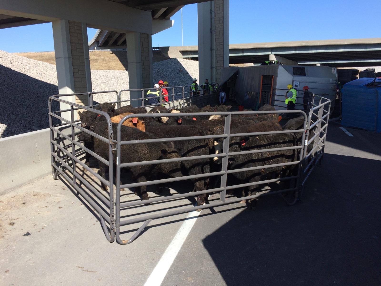 The Kansas Department of Transportation closed ramps about noon Friday near Kansas 10 and Interstate 435 after an semi-trailer truck overturned on the westbound Interstate 35 lanes to Kansas 10, releasing dozens of cows.