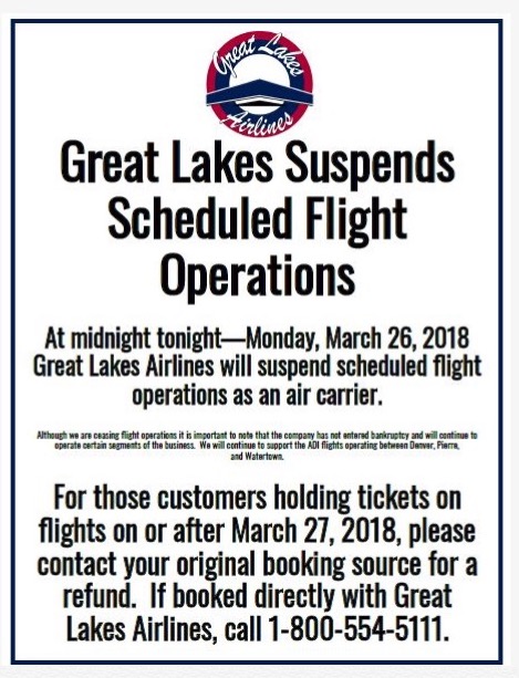 Commercial flights in and out of Salina are temporarily halted. Great Lakes Airlines, the air carrier which serves Salina, suspended flights earlier this week.