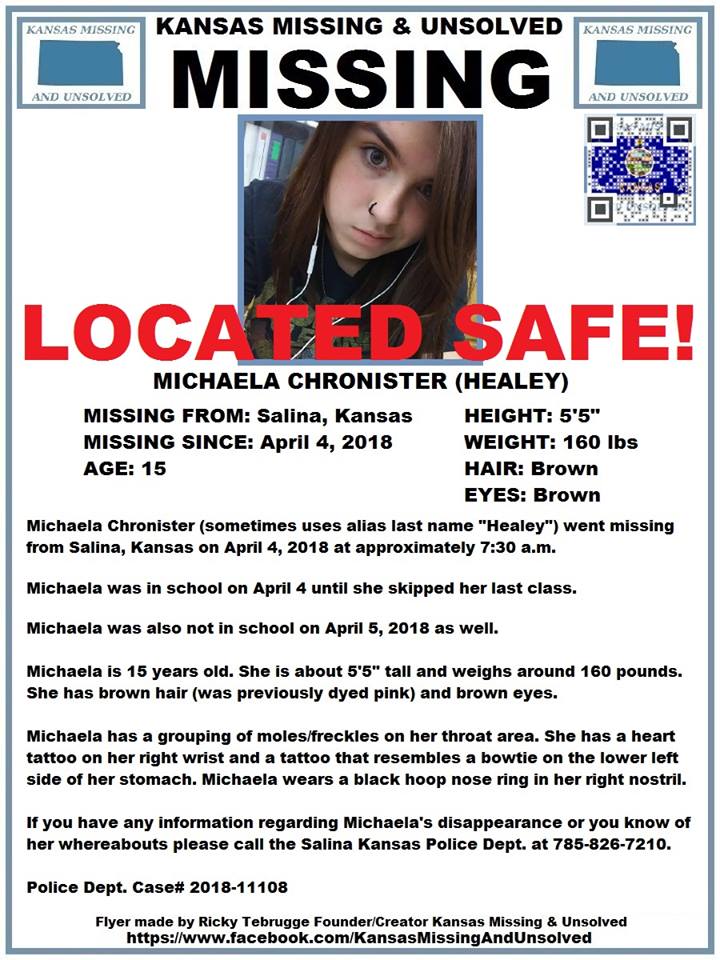 Kansas Missing and Unsolved tells KSAL News that 15-year-old Michaela Chronister (Healy) went missing earlier this week,