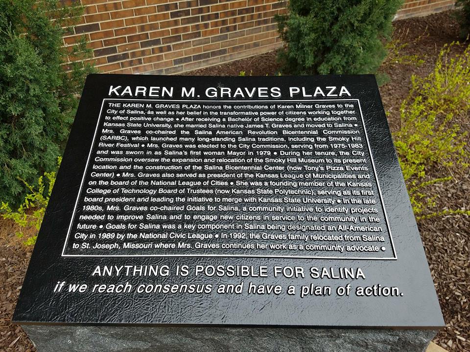 A ceremony on Monday will honor one of the most influential women in the history of Salina. The first woman mayor will be honored when the north outside plaza of the Tony’s Pizza Events Center is dedicated as the “Karen M. Graves Plaza.”