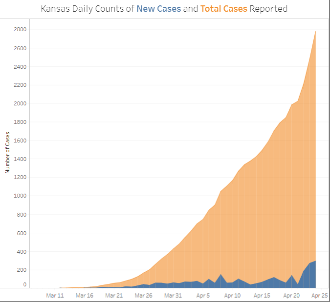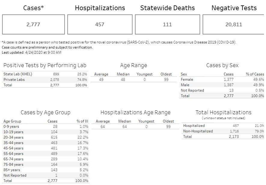 - Friday, April 24: 2,777 case of COVID-19, 111 deaths* (KDHE has taken one death away from the total) and 20,811 people have tested negative for the disease.