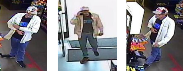 The man is a white male, 50-60’s, approximately 5’10, 180 lbs, wearing glasses, with a graying goatee and brown hair. He was wearing a primarily white baseball cap that had multi-color splashes