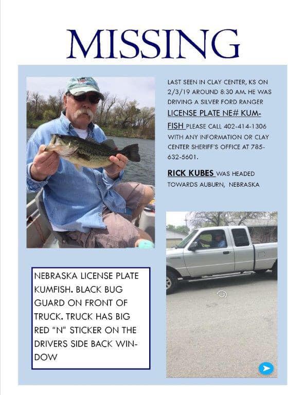 Kubes was last seen between 8:00 – 8:30 on Sunday morning in Clay Center before he left to return to his home in Auburn, Nebraska. Auburn is about a 2.5 hour drive from Clay Center. Kubes travels from Clay Center north on K-15 to Highway 36 then East bound on 77 then North to Beatrice Nebraska and then east on 136 to Auburn. His family says that he doesn’t travel outside this normal route.