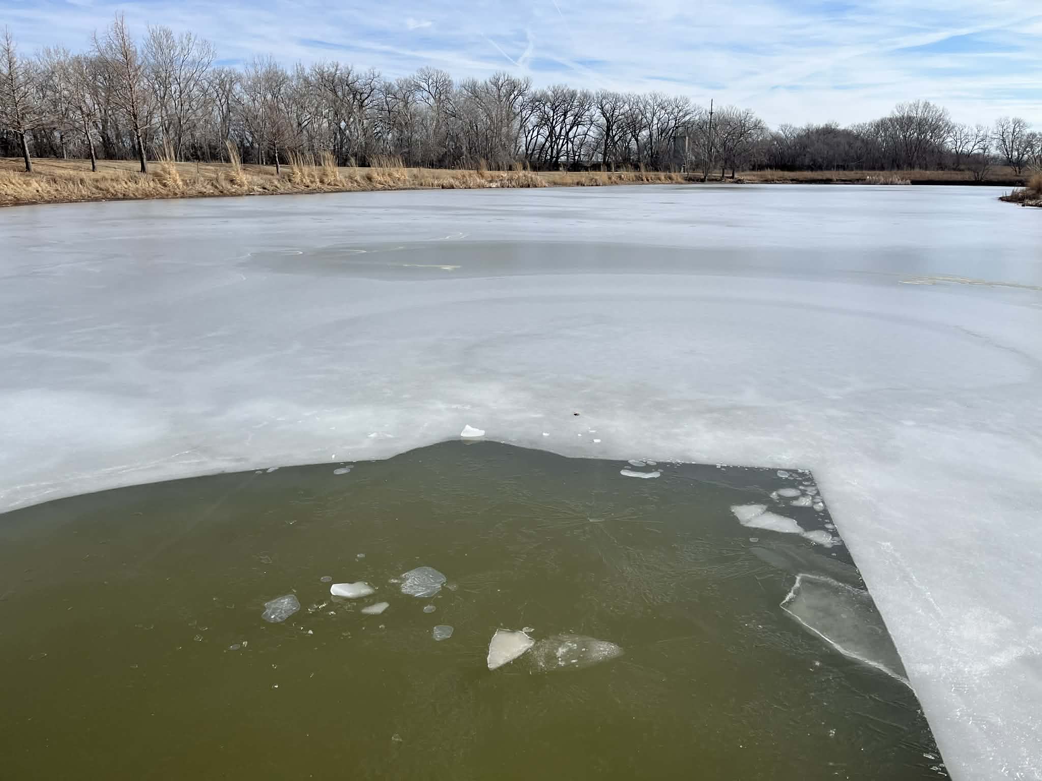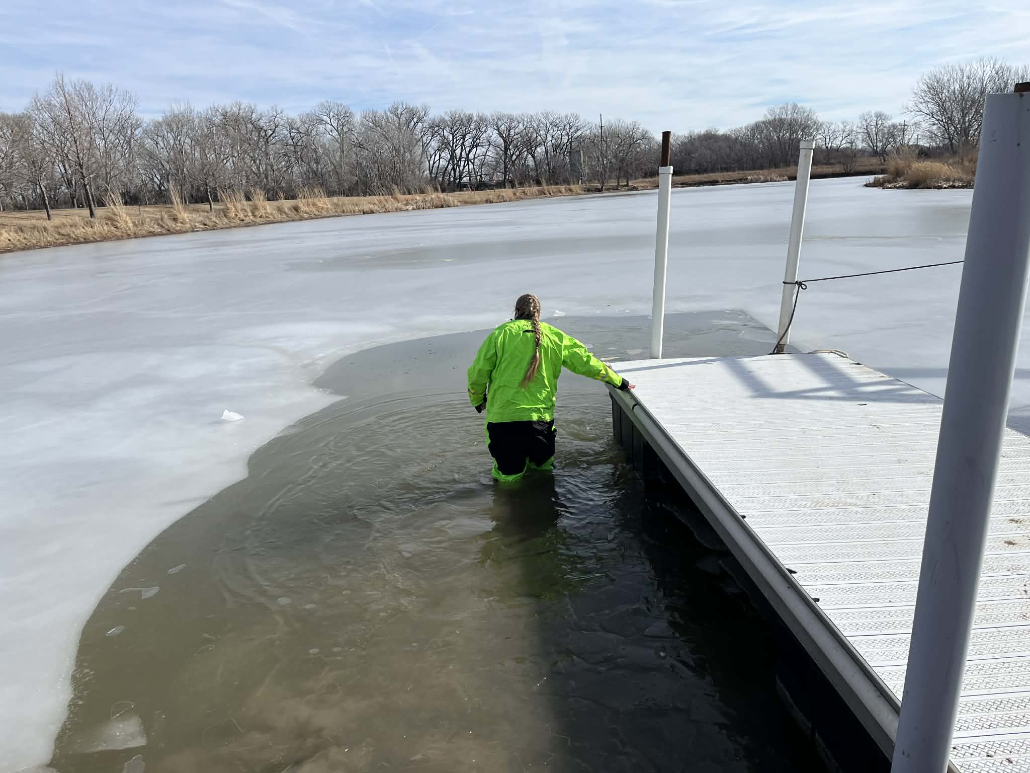 The main event of the day was a plunge off a dock into the lake on the property. The Saline County Mounted Patrol and Rescue Squad Dive Team used a chainsaw to cut a hole in the ice, which was three inches thick.