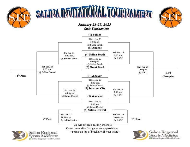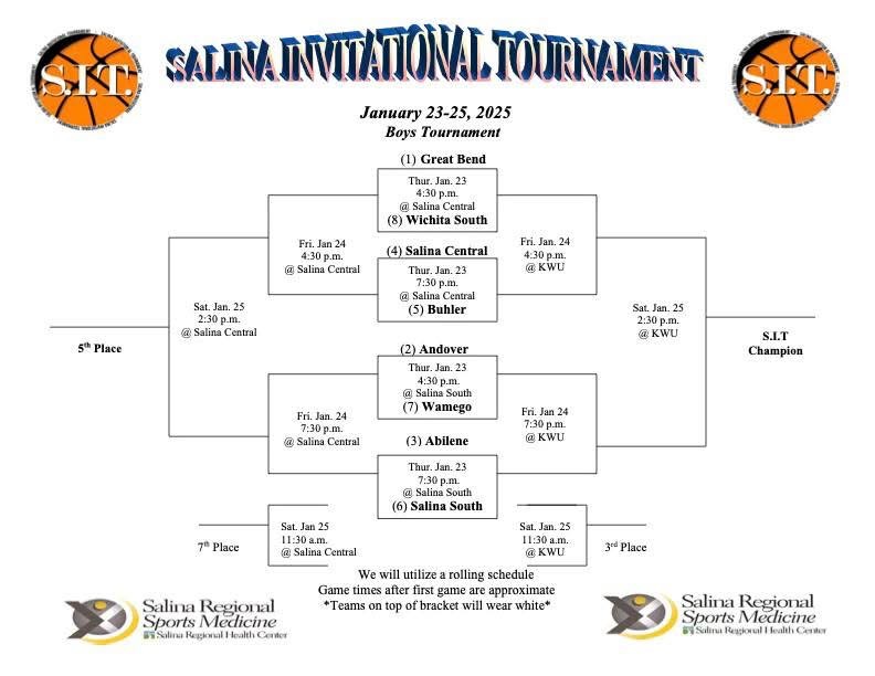 This year’s Salina Invitational Tournament begins Thursday, January 23rd. The first round matchups will be held at Salina Central and Salina High Schools. The championship side of the bracket will be hosted by Kansas Wesleyan University while the remaining consolation matchups will be at Salina Central.
