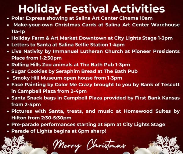 Salina Downtown is ready for one of its most anticipated events of the year, the Christmas Festival and Parade of Lights. This Saturday will be a day full of jolly good holiday fun.