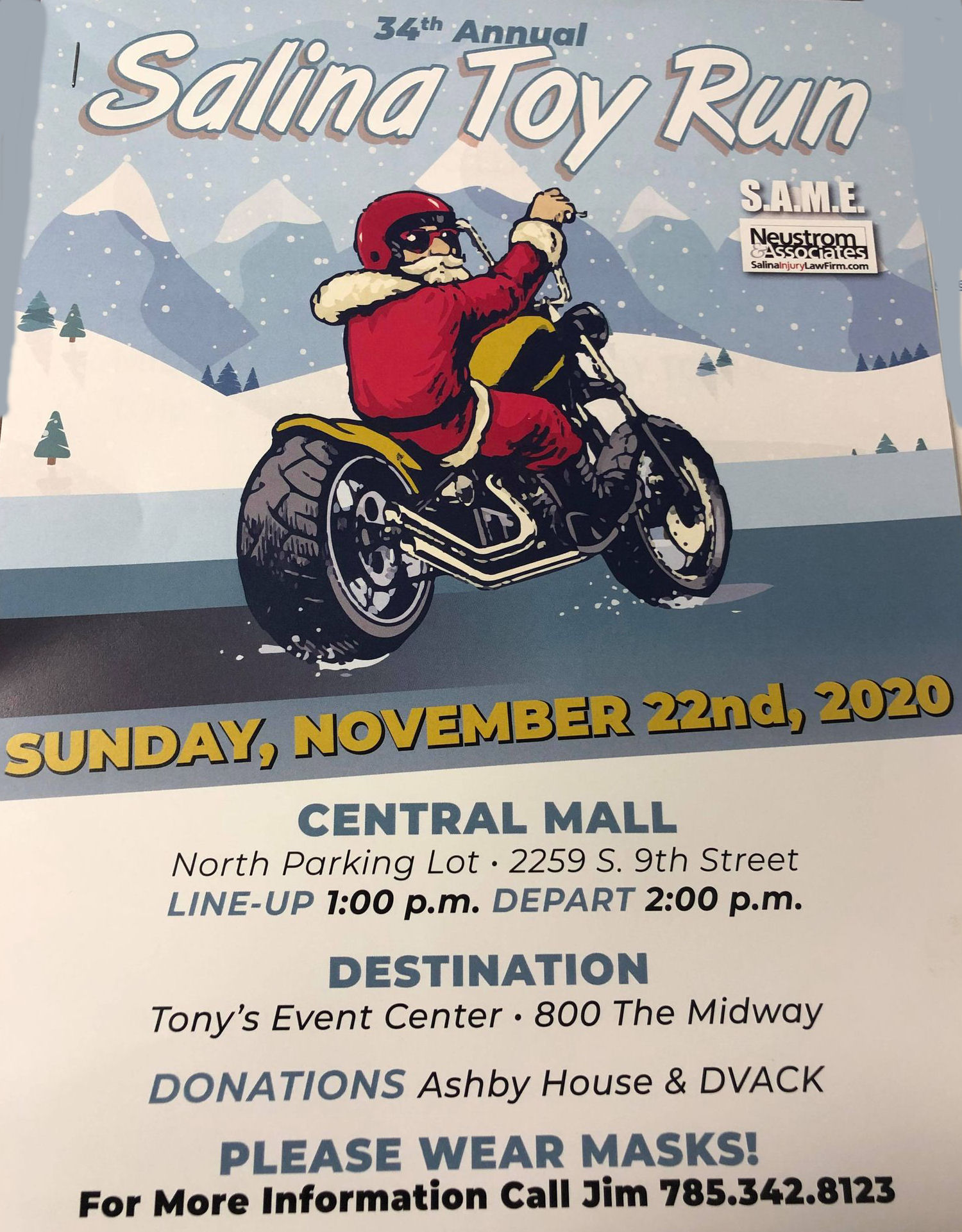 For the 34th year in a row the Salina Toy Run will provide hundreds of toys to needy children. Toys collected during the Salina event will be donated to Ashby House and Domestic Violence Association of Central Kansas.