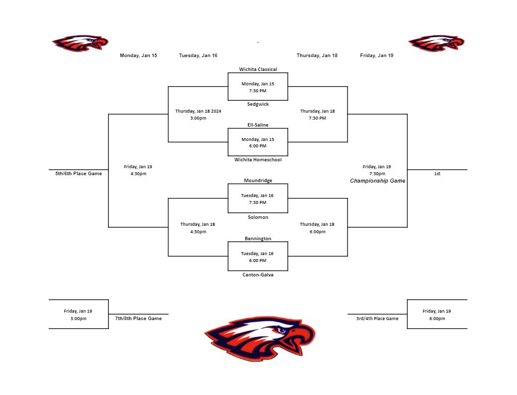 Edit: Due to forecasted weather early next week they have decided to move the Canton-Galva tournament to Thursday 1/18, Friday 1/19, and Saturday 1/20. Ell-Saline will play Wichita Homeschool @ 3:00 on Thursday, 1/18. Once we get the updated bracket with the correct date and times it will be posted below.