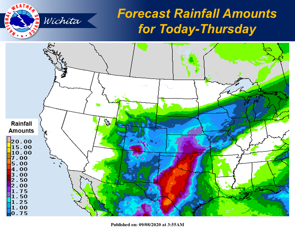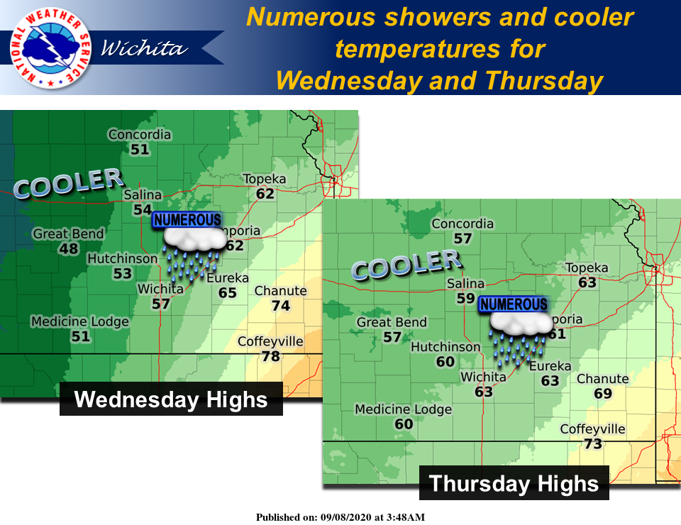 Numerous showers and cooler temperatures will prevail across the region for later Tuesday, and into Wednesday and Thursday. Prolonged periods of rain could result in higher rainfall amounts of 1 to 2 inches across central and south central Kansas.