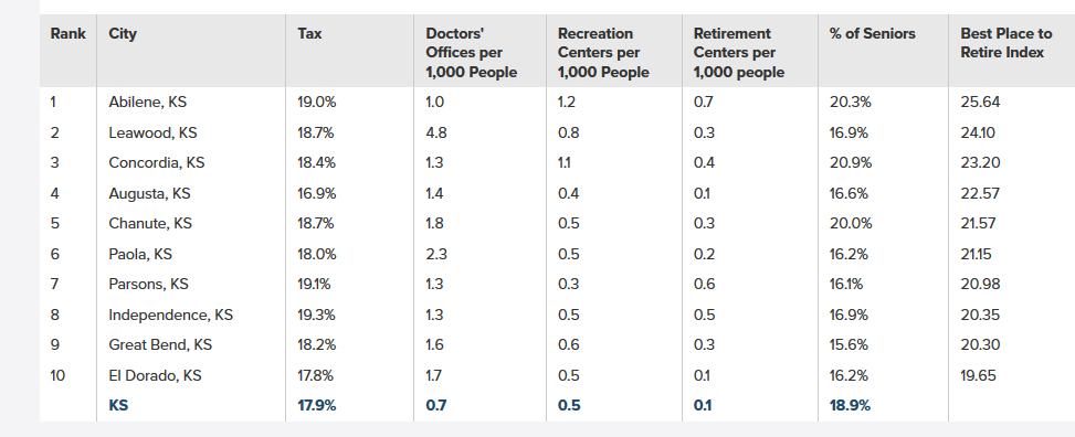 The study from SmartAsset ranked the 10 best places to retire in Kansas. The study considers taxes – both income and sales, the number of doctors’ offices and opportunity for recreation and social life.