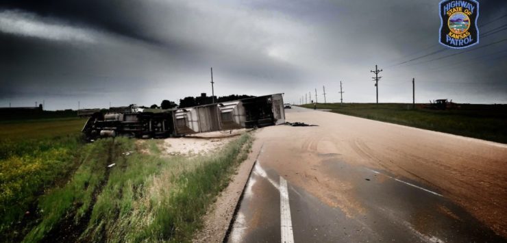 According to the Kansas Highway Patrol, 63-year-old Gary Leister was driving a 2002 International semi truck puling a trailer, headed south on K 15 Highway. He drove onto the right shoulder, over-corrected, and overturned into the ditch. The truck came to rest on the passenger side.