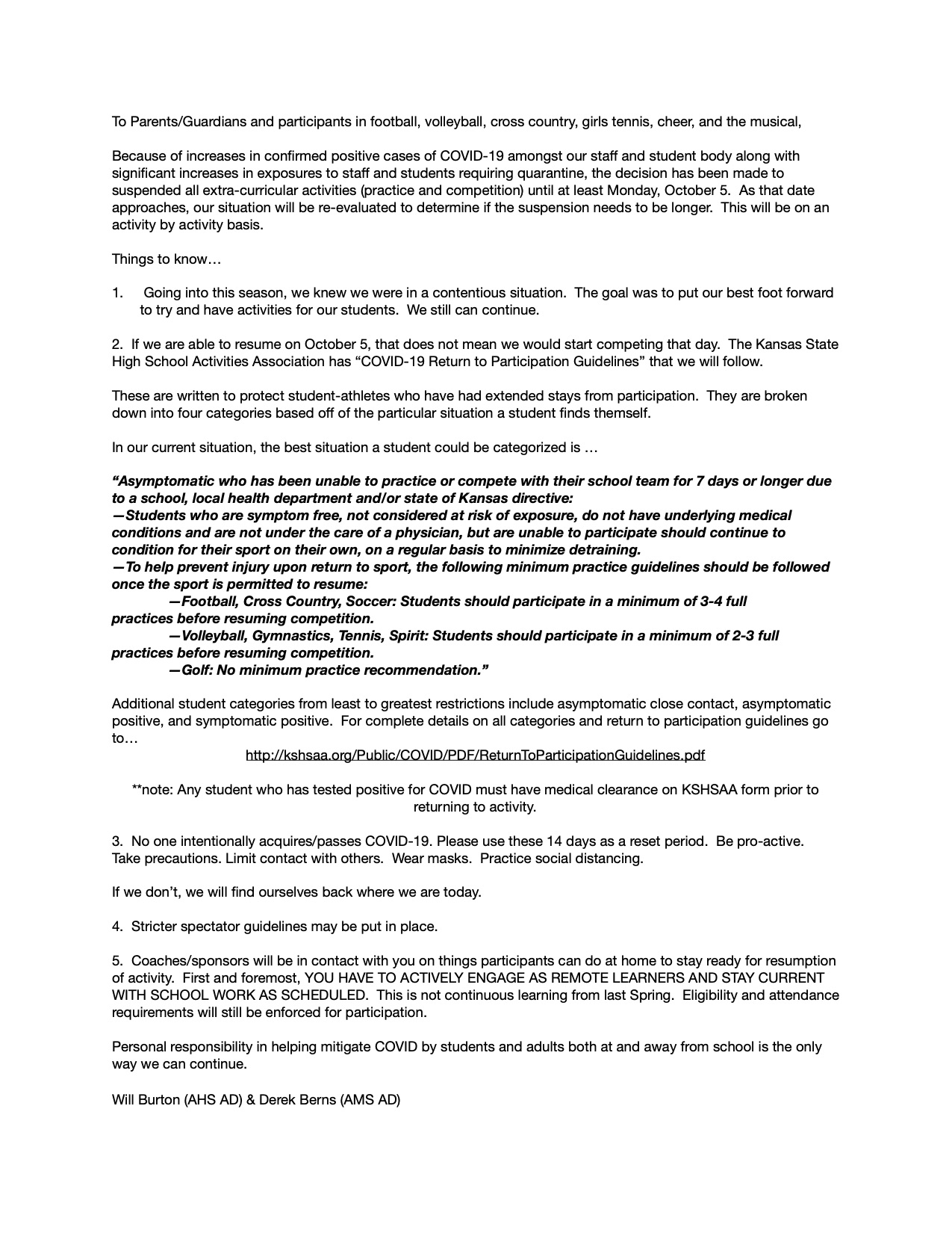 - Starting Tuesday, Sept. 22, there will be no activities, including athletics, for Abilene schools.