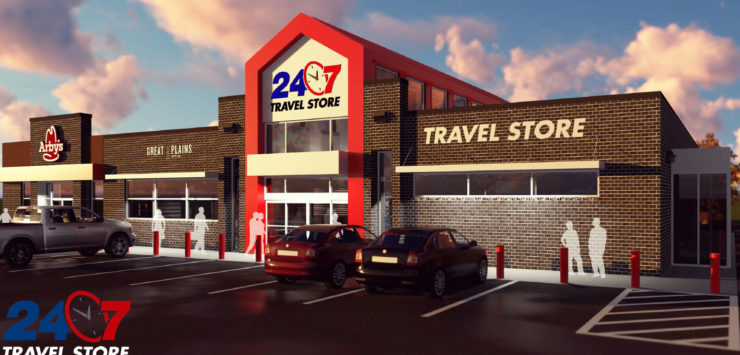 The store will include large touch free restrooms, the Great Plains Gift Co., state of the art coffee and fountain service, enhanced convenience store products, water/beer cave with free cold refillable water bottle fill, safe room for travelers, customer seating area with free WIFI and video screens, weather information, and community information for travelers. Truck drivers will have access to shower and laundry service, a truck supply area, and truck plug ins for cold weather on a paved 20 stall truck parking area.