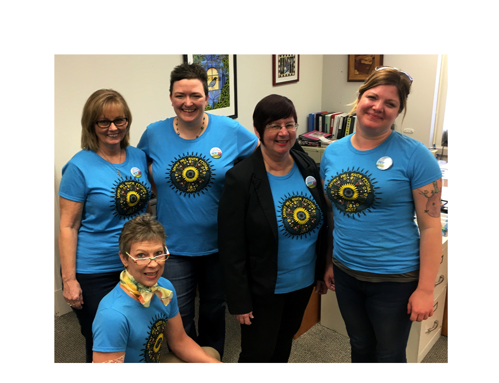 The Festival 2017 T-shirt design features a circular shape with familiar Midwestern icons. “I thought a mandala-like design would work well to symbolize what a well-rounded and layered event the Festival is, with so many different artists, musicians, and food and drink vendors,” says Pickman. “Small icons to represent each of those aspects are scattered throughout the design. Most importantly, I wanted to convey the feeling of Kansas and the Smoky Hill River. Hopefully the waves and sunflower in the middle and the wheat on the outside of the design do just that.”