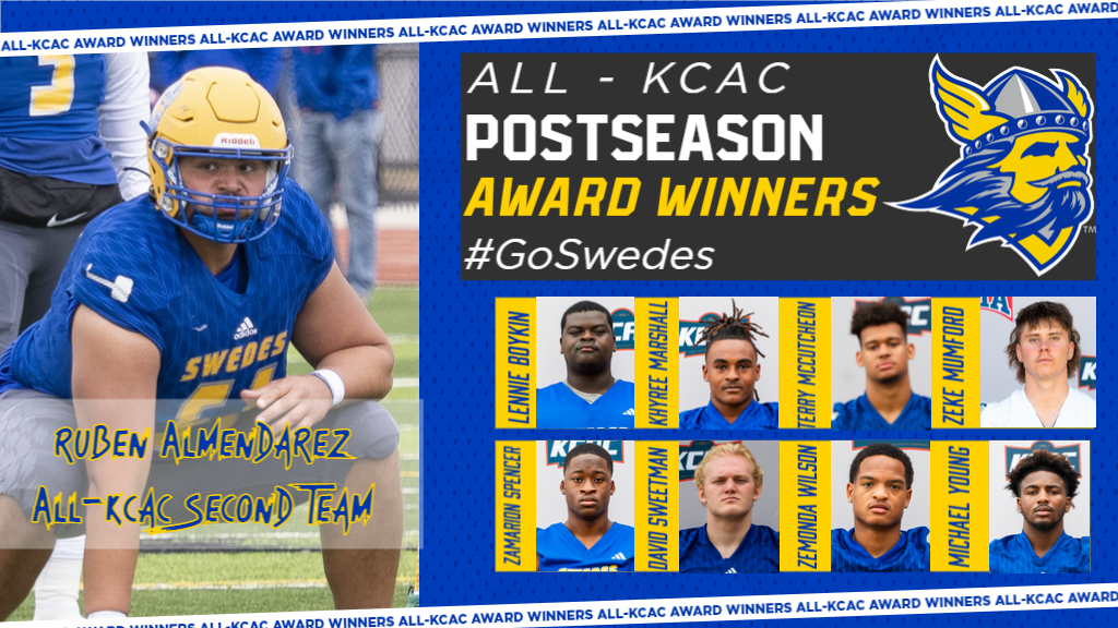 LINDSBORG, KAN. – The Kansas Collegiate Athletic Conference (KCAC) has announced the 2023 All-KCAC honorees and individual award winners, as voted on by the conference’s football head coaches. Eight Swedes were announced as winners: Ruben Almendarez, Khyree Marshall, Terry McCutcheon, Zeke Mumford, Zamarion Spencer, David Sweetman, Zemonda Wilson, & Michael Young.