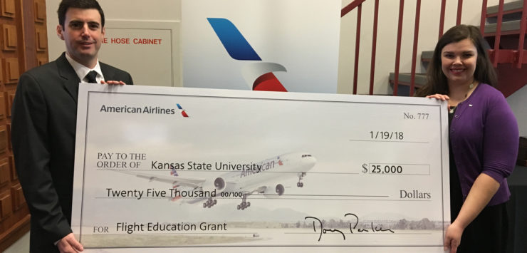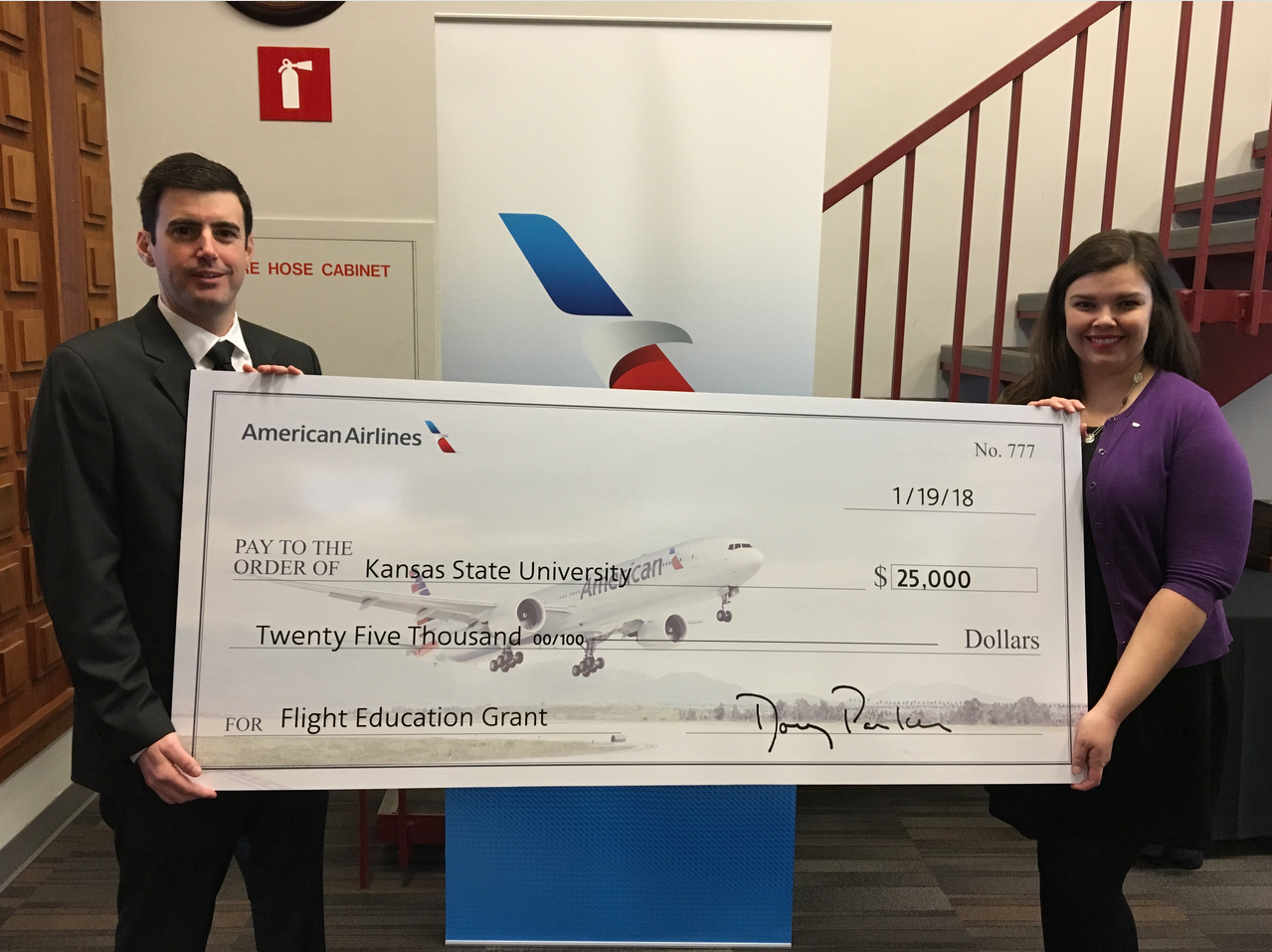 Ben Jaffee, left, senior assistant chief flight instructor, and Kirsten Zoller, training and event coordinator, accept a $25,000 grant from American Airlines on behalf of Kansas State University Polytechnic Campus. (Kansas State University Photo)