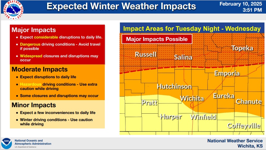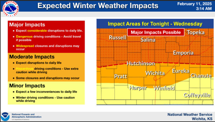 According to the National Weather Service, widespread snow is anticipated, with the heaviest snow likely across central Kansas. The highest totals continue to be expected along and north of Interstate 70, where up to 8 inches and even greater are possible.