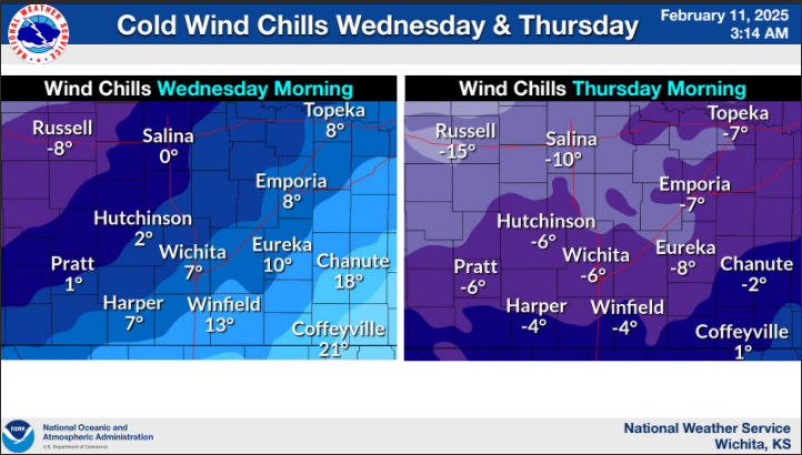 Bitterly cold wind chills are expected Wednesday and Thursday mornings with values as cold as 18 below.