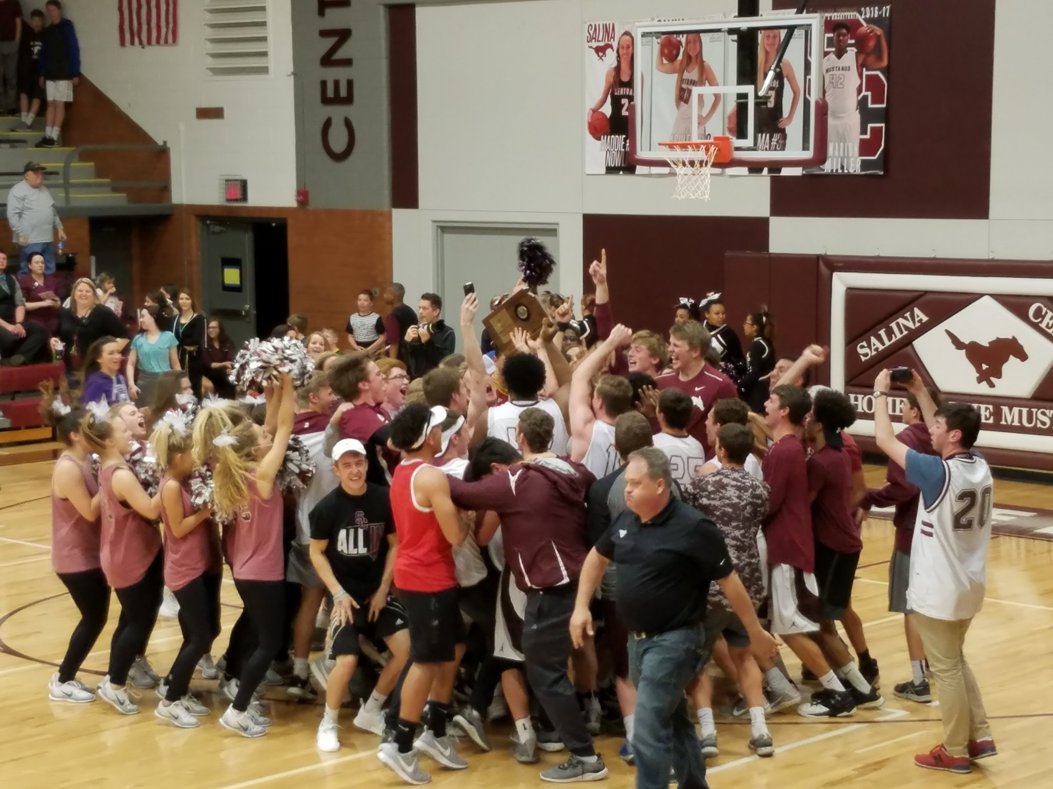 - Students celebrate with the Salina Central Boys Basketball Team.