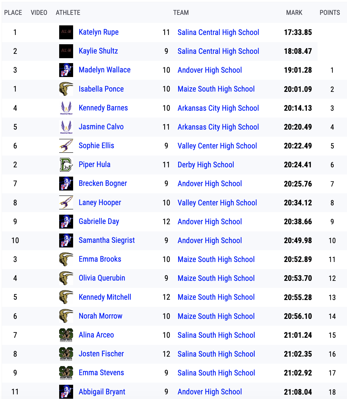 Varsity Girls 5000 Meter Run Finals Team Scores
