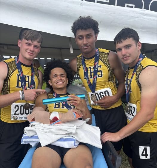 Physically unable to be on the medal stand, Manny McVay was joined by teammates Isaiah Garrett, Payge Rodenbeek, and Ayden Levendofsky after the ceremony, all wearing their gold medals as Manny held the winning baton in his uninjured left hand.