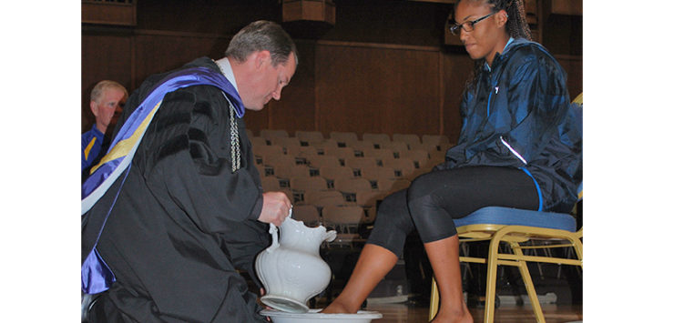 In his address to students, faculty and staff, President Jones stated he wanted his actions to speak louder than his words, when he washed the feet of Bryanna Taylor, a senior from Monrovia, California. He challenged those at the convocation to join him in making a public statement about their willingness to serve others.