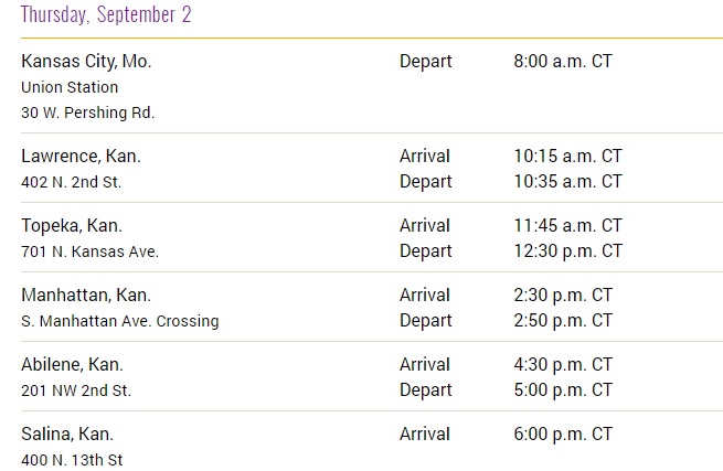 At the tail end of the journey the locomotive will depart Kansas City on Thursday, September 2nd. After making several stops along the way it is scheduled to arrive in Salina at 6:00 that evening. It will depart the next morning, at 9:00 on Friday, September 3rd, headed to Denver.