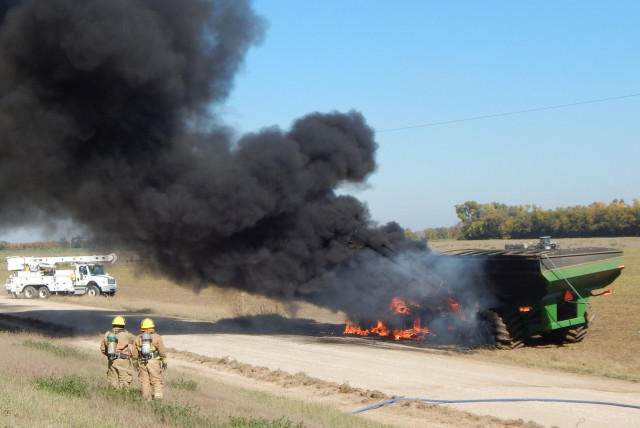 A tractor was pulling a grain cart, preparing to unload the grain into the semi. A shaft on the cart came into contact with an overhead power line.