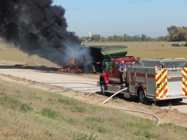 A tractor pulling a farm implement is on fire, and powerlines are down along Ohio Street, just south of Farrelly Road. Firefighters had to wait for Westar Energy crews to disconnect power before fighting the fire.