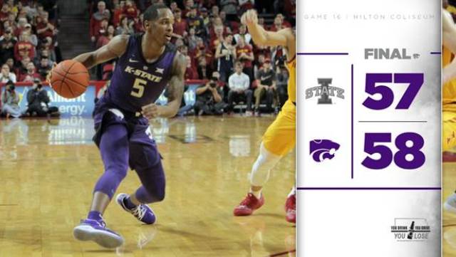 MANHATTAN, Kan. – Senior Barry Brown, Jr.’s driving lay-up with 4 seconds helped lift Kansas State past No. 20/21 Iowa State, 58-57, on Saturday before a sold-out crowd of 14,384 at Hilton Coliseum.