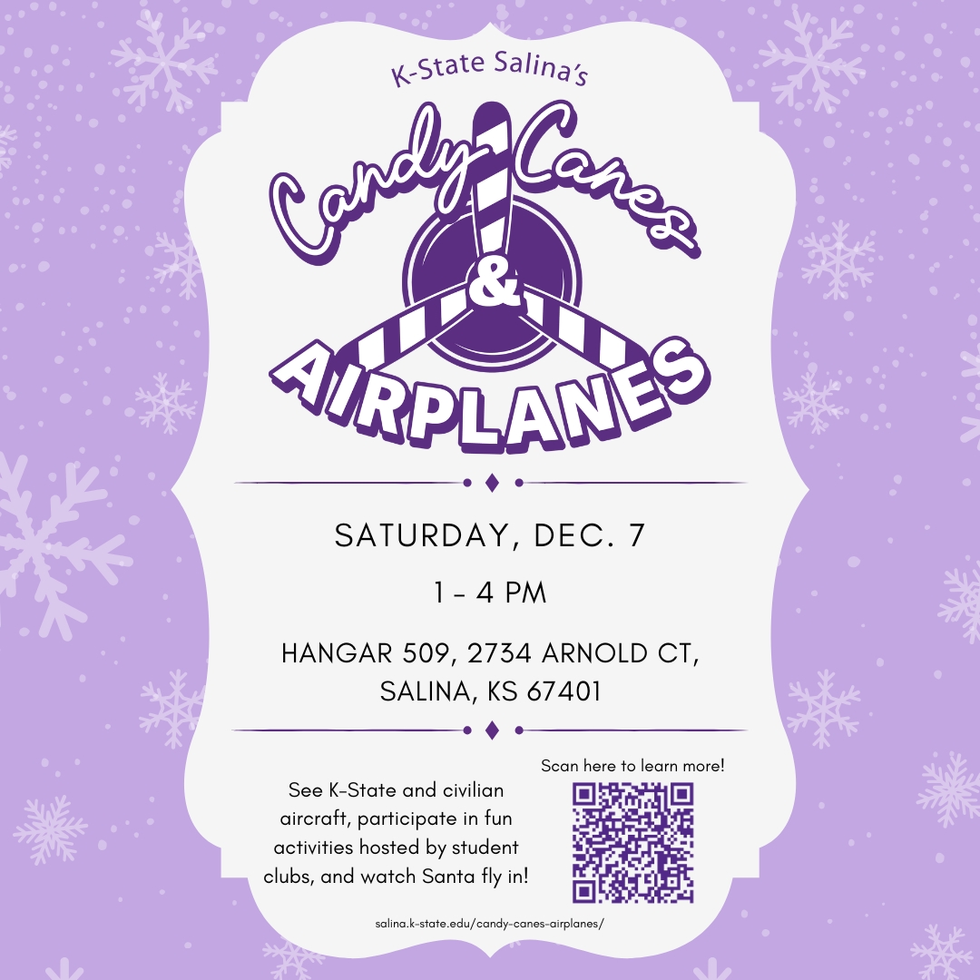 The Kansas State University Polytechnic Campus hosts Candy Canes and Airplanes the first Saturday in December each year. The community is invited to this holiday open house to greet Santa as he flies into Salina.