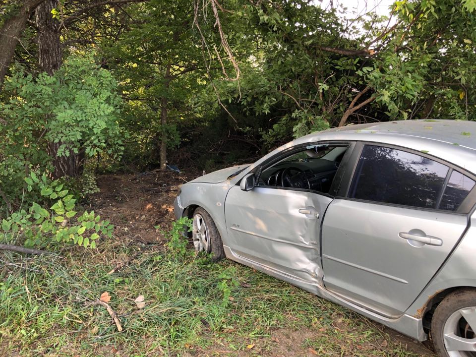 The car veered off the road and into a tree line. It came to a rest after sliding and crashing into a large tree. Rupert said had it not been for the tree the car would have ended up in the Smoky Hill River.