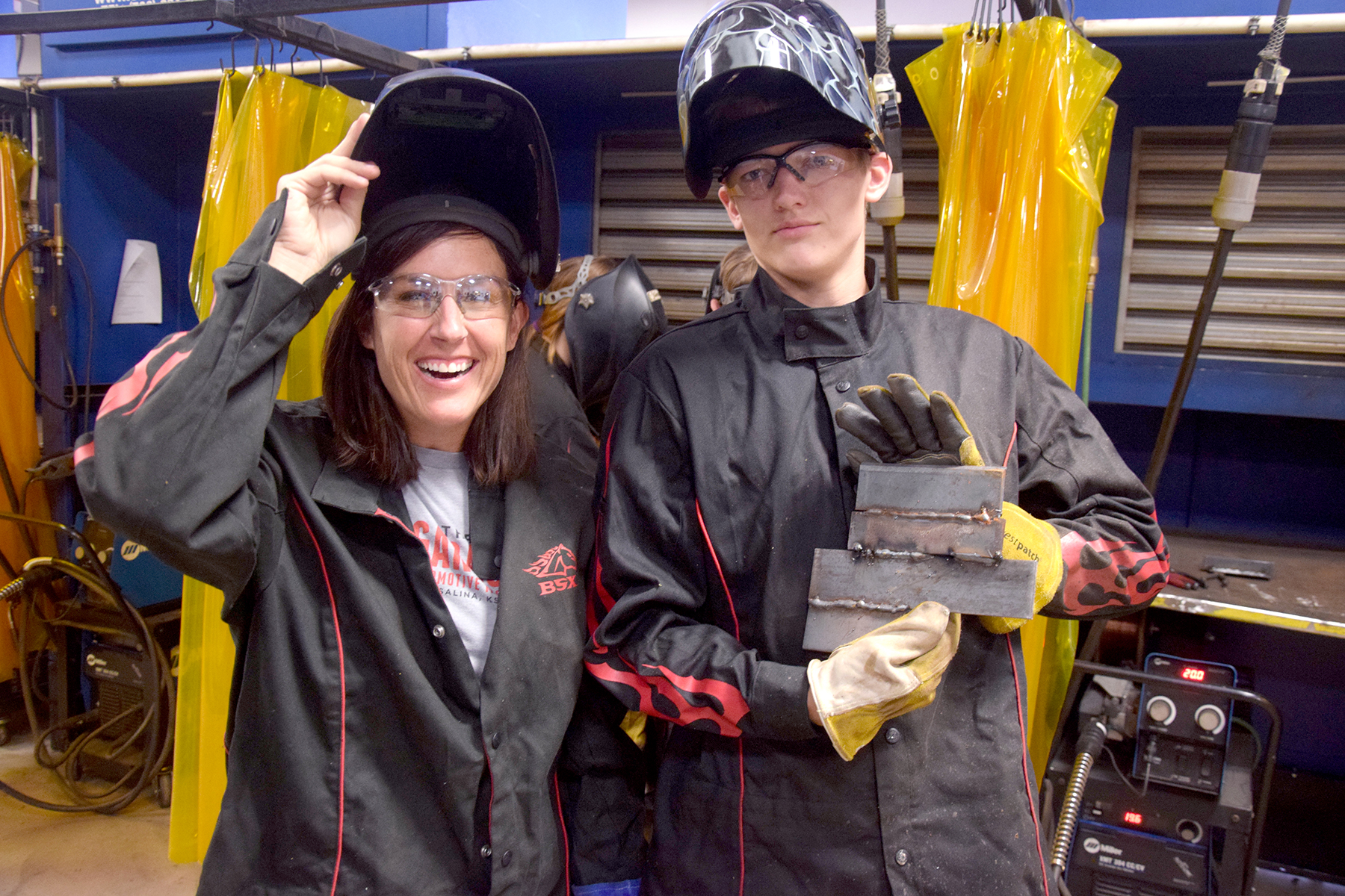 After spending a few minutes explaining welding theory and safety, Salina Tech welding instructor Eric Vannoy got everyone into welding jackets, gloves and helmet, and they headed out to the shop where he began demonstrating some welds.