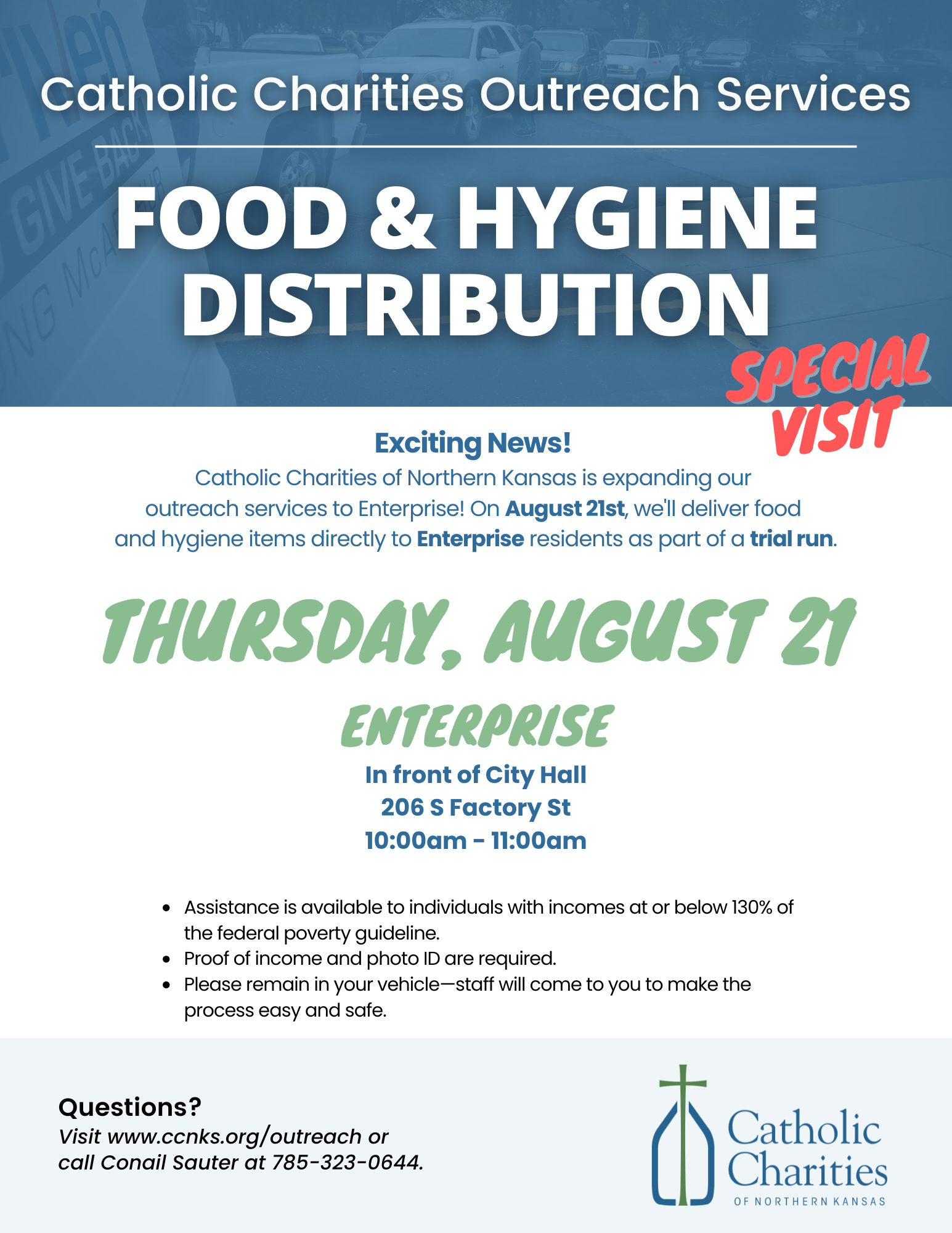Catholic Charities currently visits 28 rural communities across the Diocese of Salina every month, in addition to serving from its three office locations in Hays, Salina, and Manhattan. Future monthly visits to Enterprise will depend on the needs observed and the community response during the August 21st outreach stop.