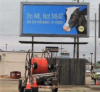 PETA notes the billboard, which us located at the corner of Crawford Street and Plaza Drive just east of Sunset Plaza, is less than half a mile from a McDonald’s restaurant.