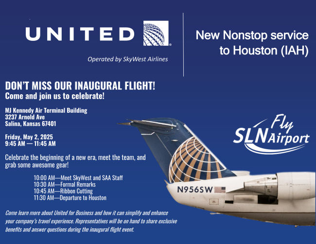 The Salina airport is planning a celebration prior to the first flight lifting off to a new destination. Events are planned to commemorate the inaugural United Express flight from Salina Regional Airport (SLN) to Houston’s George Bush Intercontinental Airport (IAH) on Friday, May 2nd.