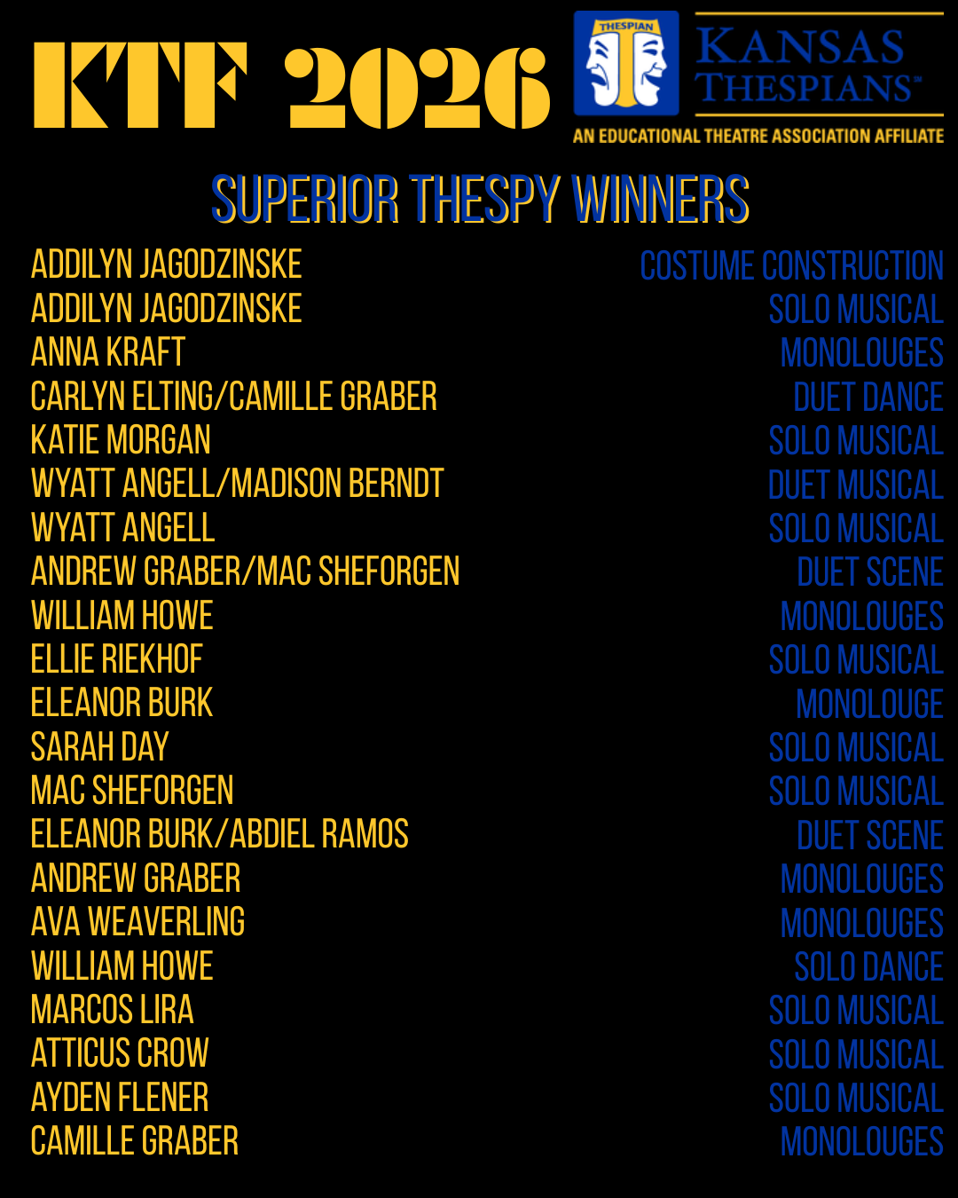 Students also received honors for their individual events known as Thespys at the Festival. 21 students from Central earned a Superior (highest rating) rating on their individual events that were comprised of duet scenes, monologues, and musical solos and duets. This has earned these students a qualification for the International Thespian Festival held yearly in June in Bloomington, Indiana at the University of Indiana, Bloomington.