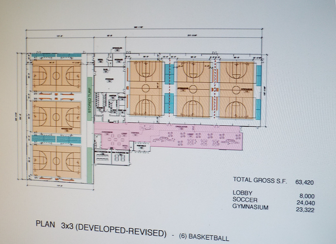 The preferred concept, “3X3 – B”, would be 63,420 square feet. It includes an 8,000 square foot lobby, 24,040 square feet for soccer, and 23,322 square feet of gymnasium space. It includes six courts, which can be used for basketball. Three of the courts can also be converted to turf for other use. It also includes an enlarged lobby and more parking.