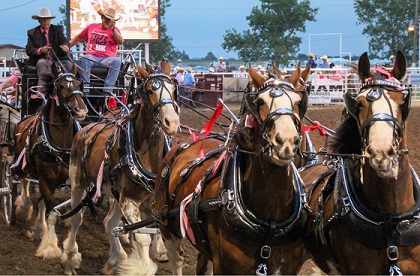 The Clydesdales will be in the parade on August 4 at 4 pm, and in the rodeo all four nights: August 3-6. They will also be on display on the east side of the rodeo grounds during the day, for the public to visit.