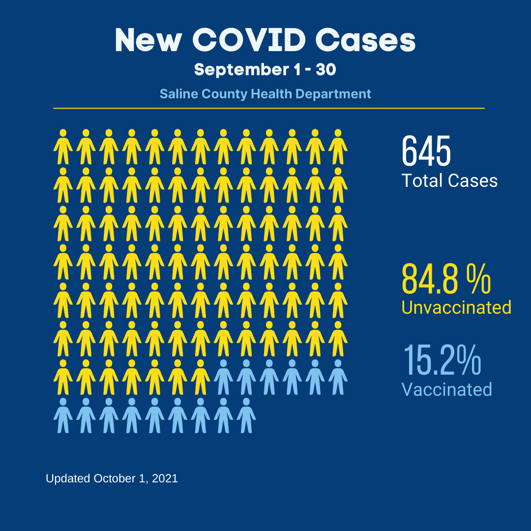 According to the Saline County Health Department, during the month of September 645 new cases of COVID-19 were reported. Of those cases reported, 547 were unvaccinated, and 98 were vaccinated.