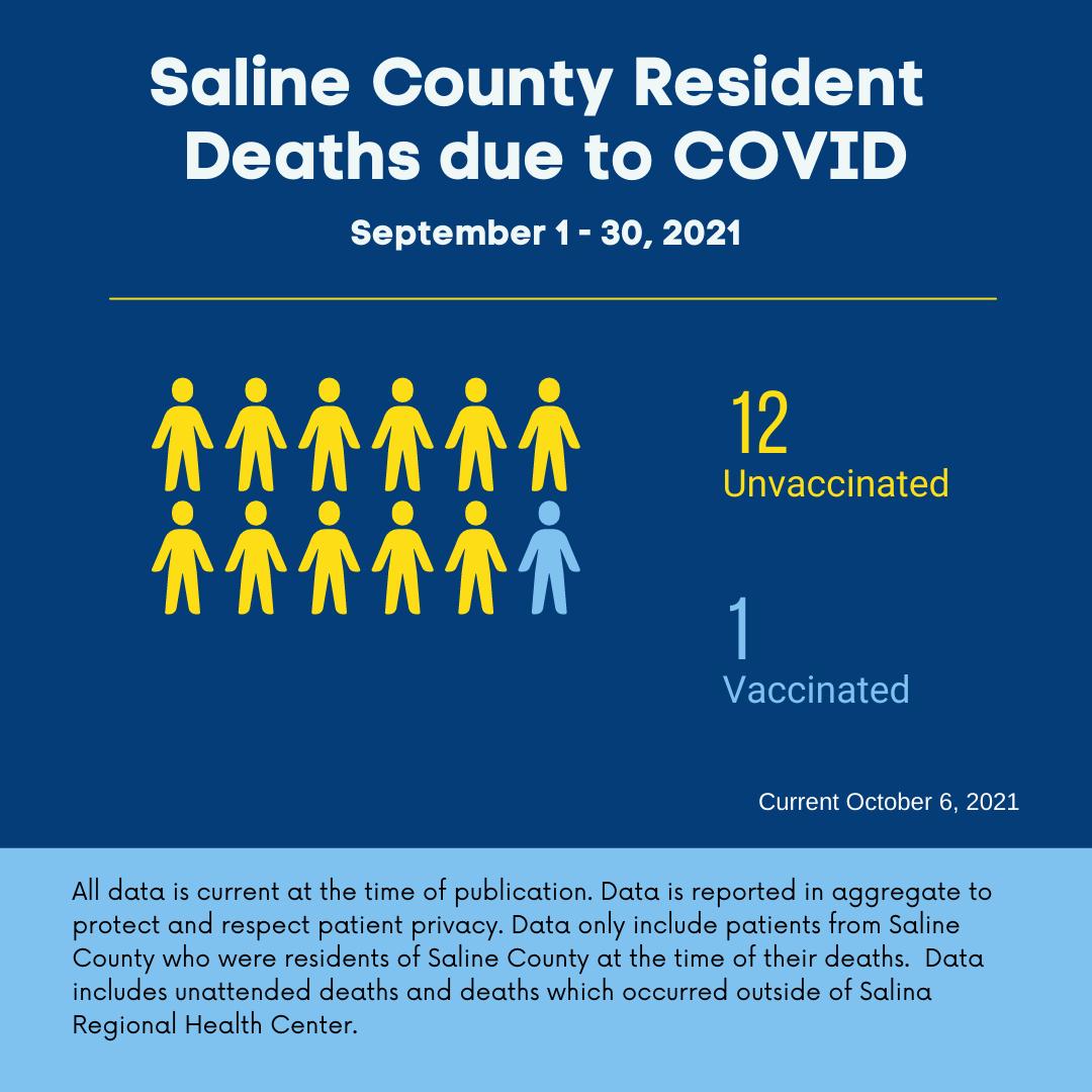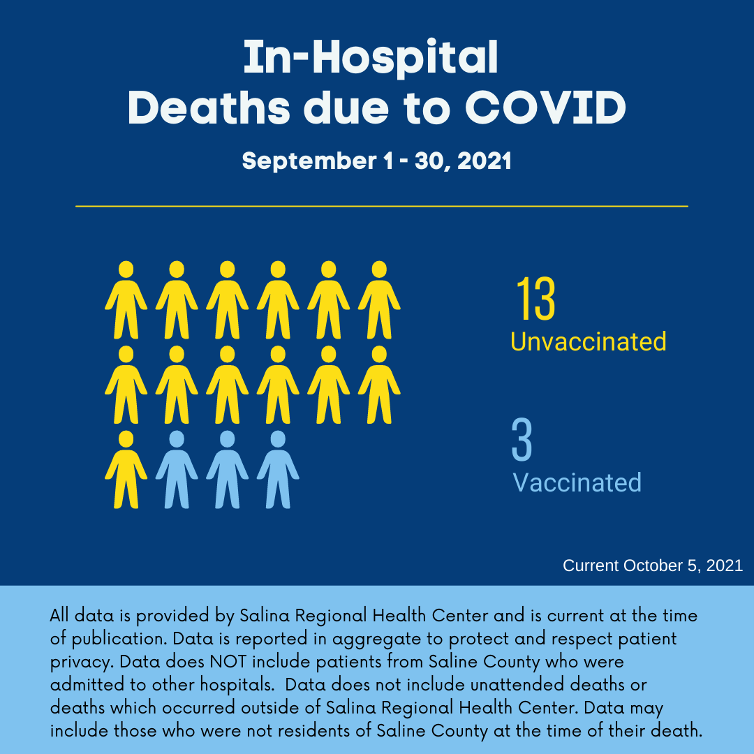 During the month of September, 13 residents of Saline County lost their lives to COVID-19. In the same month, Salina Regional Health Center reported 16 in-hospital deaths due to COVID-19.