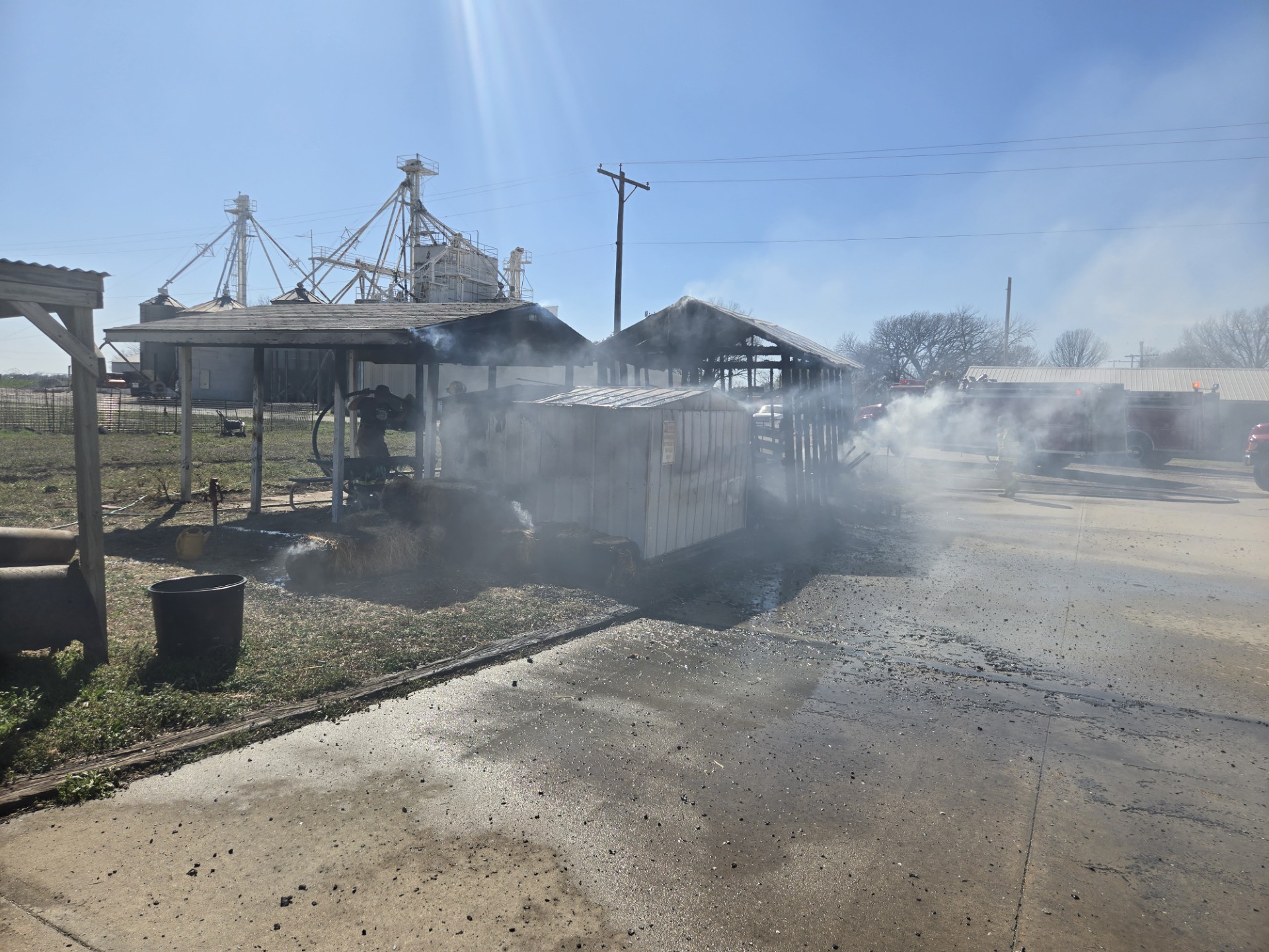No one was injured after a fire burned three structures near Assaria’s Community Garden on Saturday.