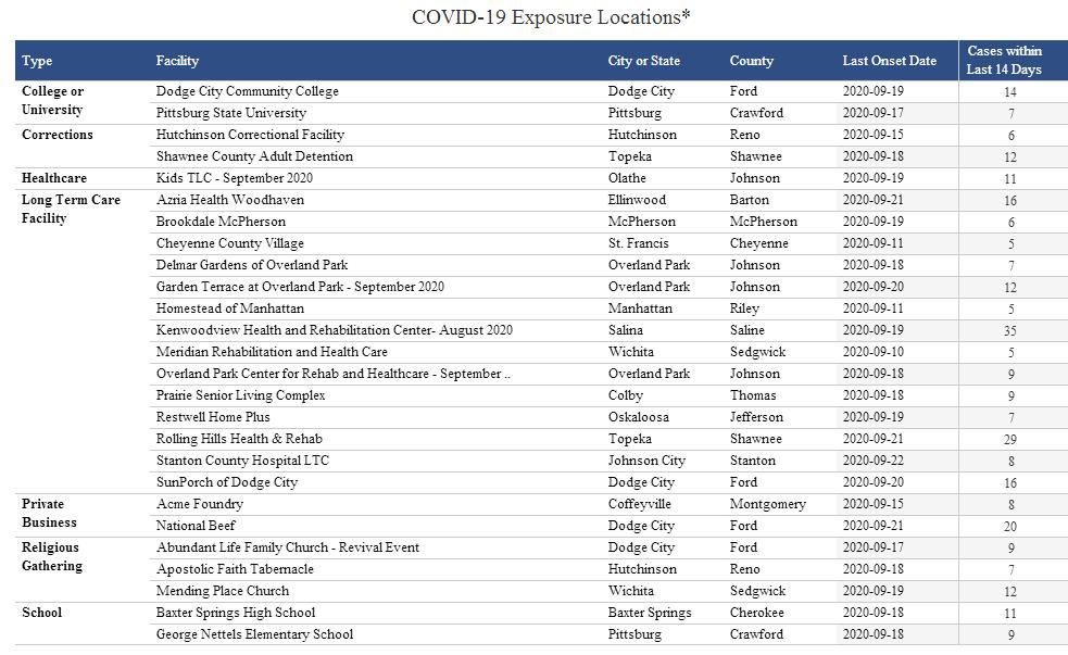 In an effort to prevent the spread of COVID-19, KDHE publishes the names of the educational institutions, daycares (excluding home daycares that are in a person’s home due to privacy concerns), gatherings (excluding private events due to privacy concerns), governmental agencies, healthcare settings, group living, long term care facilities, sports teams and events, correctional facilities, public events, business entities, etc. with five or more Kansas resident COVID-19 cases with symptom onset dates in the last 14 days. This listing includes only cases within the last 14 days. Once a location no longer has five or more cases with symptom onset dates within the last 14 days, it will be removed from the list.