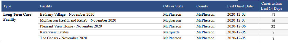 In an effort to prevent the spread of COVID-19, KDHE publishes the names of the educational institutions, daycares (excluding home daycares that are in a person’s home due to privacy concerns), gatherings (excluding private events due to privacy concerns), governmental agencies, healthcare settings, group living, long term care facilities, sports teams and events, correctional facilities, public events, business entities, etc. with five or more Kansas resident COVID-19 cases with symptom onset dates in the last 14 days. This listing includes only cases within the last 14 days. Once a location no longer has five or more cases with symptom onset dates within the last 14 days, it will be removed from the list.