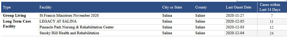 The Kansas Department of Health and Environment, in its latest list of COVID-19 exposure locations, indicates there are three clusters at Salina long term care facilities, and one at a group living facility.