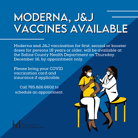 According to the agency, Moderna and Johnson and Johnson vaccinations for first, second, or booster doses for persons 18 years or older, will be available at Saline County Health Department on Thursday, December 16 by appointment only.
